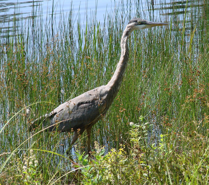 Great Blue Herons (Ardea herodias) show up rarely. This large bird does not compete with the ducks for food because Great Blue Herons eat mostly fish and the occasional frog while the ducks dabble for plants and small invertebrates. Herons catch fish by stealth. If you see one, be patient and watch as it slowly moves and seeks its prey!