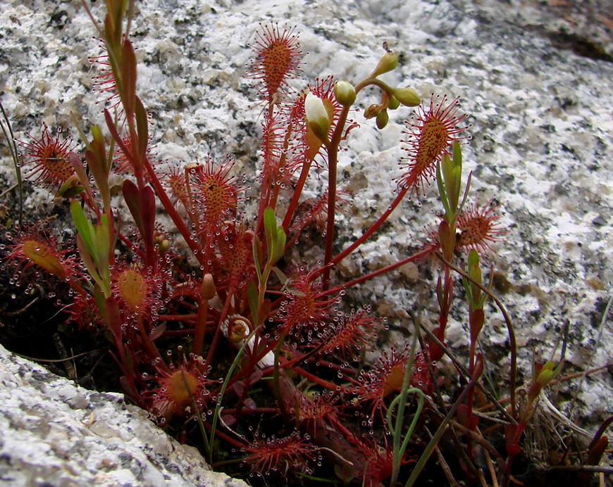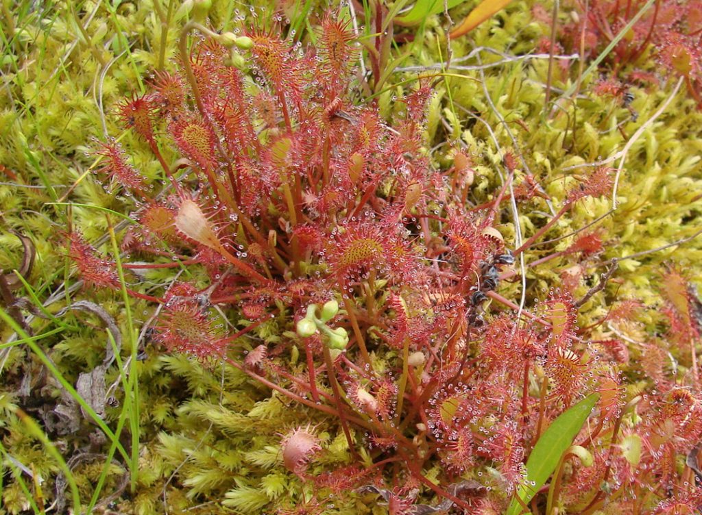 Due to their ability to capture and digest small insects, sundews are able to colonize sites that have few nutrients, particularly nitrogen-containing compounds. Small flies get caught in the sweet sticky goo at the ends of hairs on the sundew leaves and they are then slowly digested on the leaf surface by enzymes released by the plant. Drosera plants are not able to survive in most places where other plants grow because they cannot compete with larger plants.